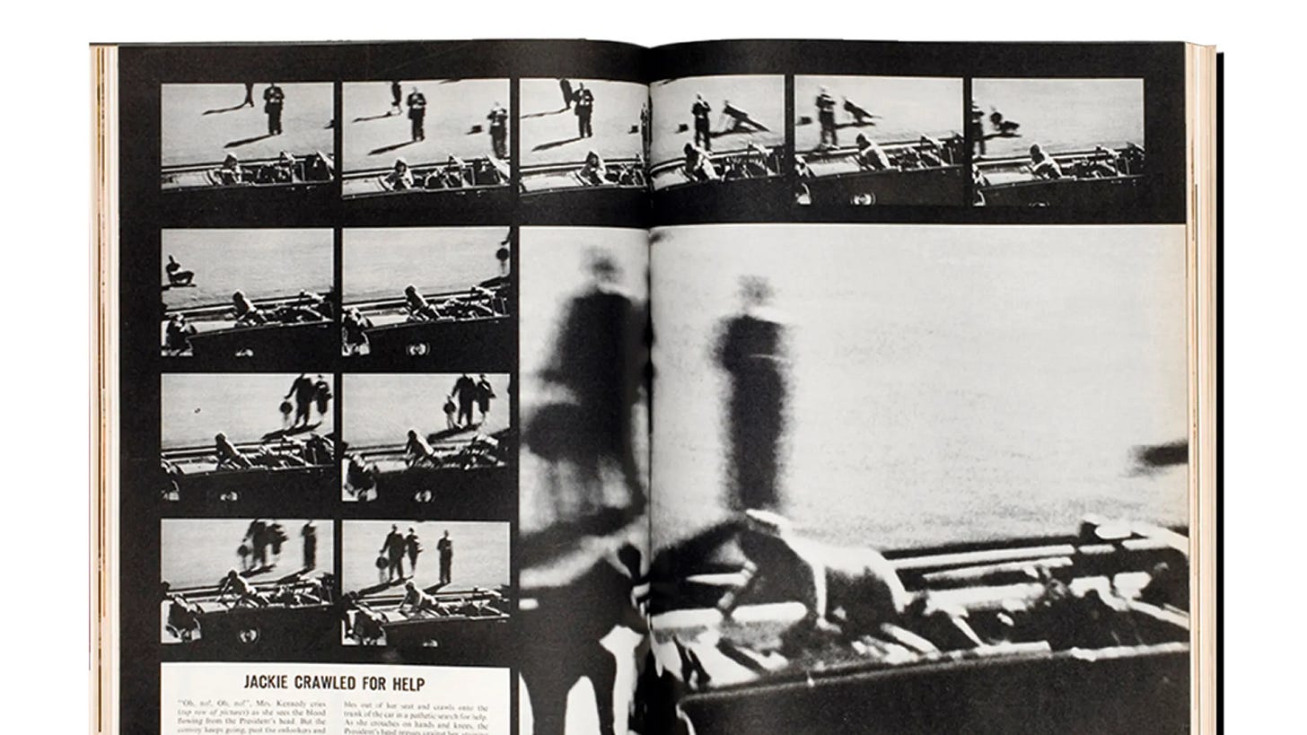 You can see the car disappear behind a sign and remmerge with the president clutching his neck, having been shot. But then frame 313 of film captures the moment when the fatal shot hits Kennedy’s head. Then Mrs. Kennedy reaches for a piece of the President’s skull that had landed on the trunk of the convertible — one of the most famous and heartbreaking images of the events.